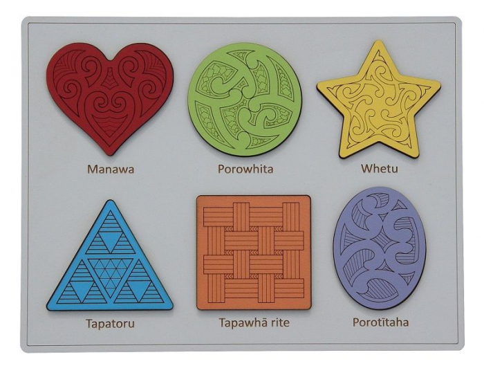 This wooden puzzle includes 6 shapes in Te Reo Māori. Featuring six common shapes Manawa - Porowhita - Whetu - Tapatoru - Tapawha rite - Porotitaha. The different raised shaped pieces are etched with a unique design. A beautiful, high quality NZ made product.